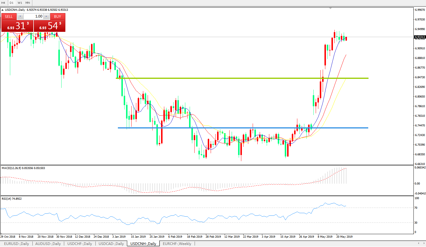 美元兑人民币USDCNH 日线图: