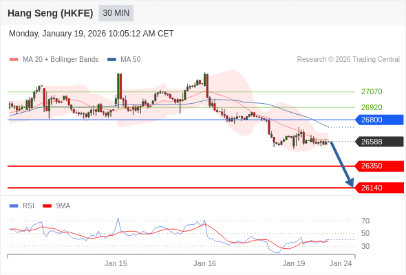 香港恒生指数期货 当日内: 存在压力。