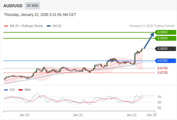 在 0.6765 之上,看涨,目标价位为 0.6840 ,然后为 0.6860 。