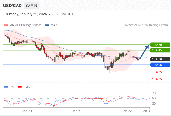 在 1.3805 之上,看涨,目标价位为 1.3845 ,然后为 1.3860 。
