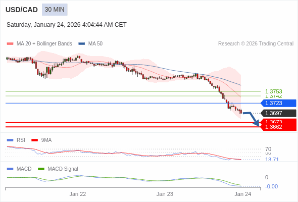 技术点评: RSI技术指标小于30。在这种情况下,说明有很强的下跌趋势,或者意味着处在超卖的状态下,可能会有向上的反弹。我们将观察RSI技术指标是否出现背离现象。 MACD技术指标处在其信号线之下看空。 配置为负。 此外,价位低于其20天及50天移动平均线 ( 分别位于1.3738 和1.3769 )。