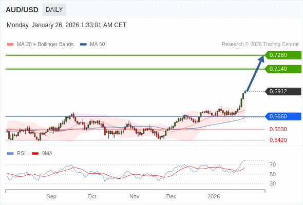 在 0.6660 之上,看涨,目标价位为 0.7140 ,然后为 0.7280 。