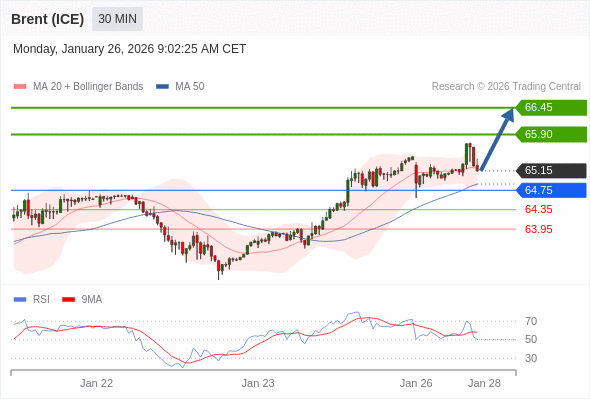 布伦特原油 (ICE) (J6) 当日内: 在64.75之上,看涨。