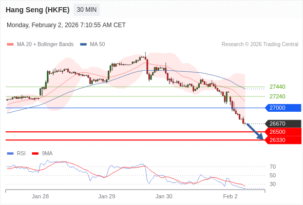 交易策略: 在 27000 之下,看跌,目标价位为 26500 ,然后为 26330 。