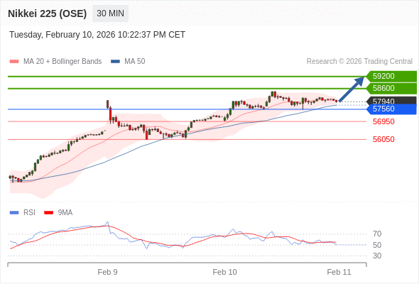 在 57560 之上,看涨,目标价位为 58600 ,然后为 59200 。