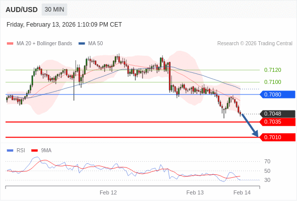 交易策略: 在 0.7080 之下,看跌,目标价位为 0.7035 ,然后为 0.7010 。