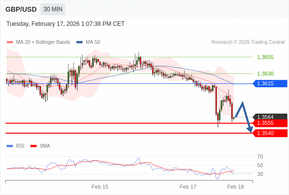 在 1.3615 之下,看跌,目标价位为 1.3555 ,然后为 1.3540 。