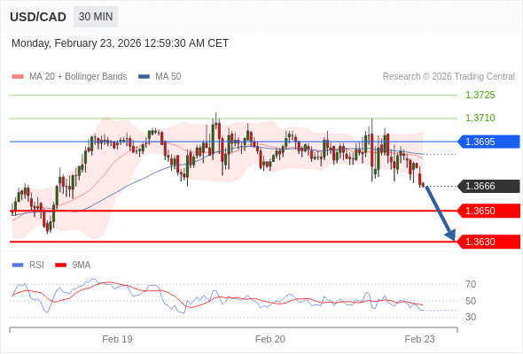 在 1.3695 之下,看跌,目标价位为 1.3650 ,然后为 1.3630 。