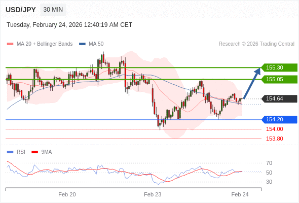 在 154.20 之上,看涨,目标价位为 155.05 ,然后为 155.30 。