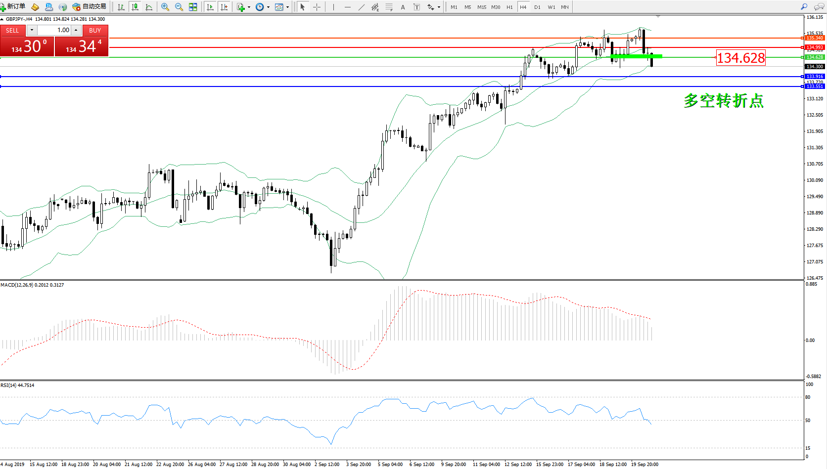 交易策略:134.628下方看跌,目标133.916133.551