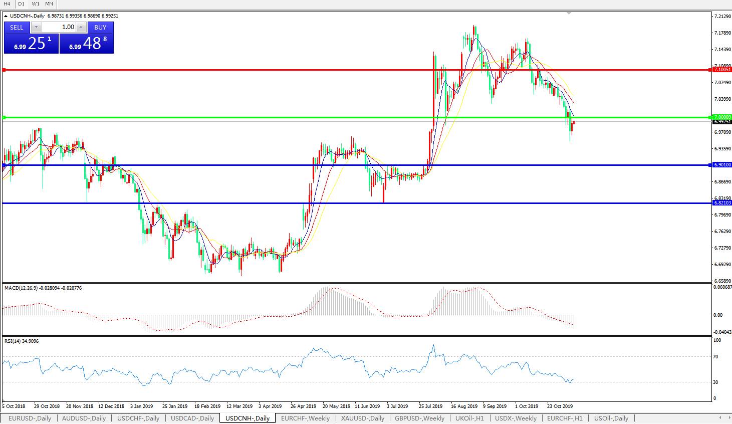 交易策略: 在7.0000之下,看跌,目标价位为6.9010,然后为6.8210。