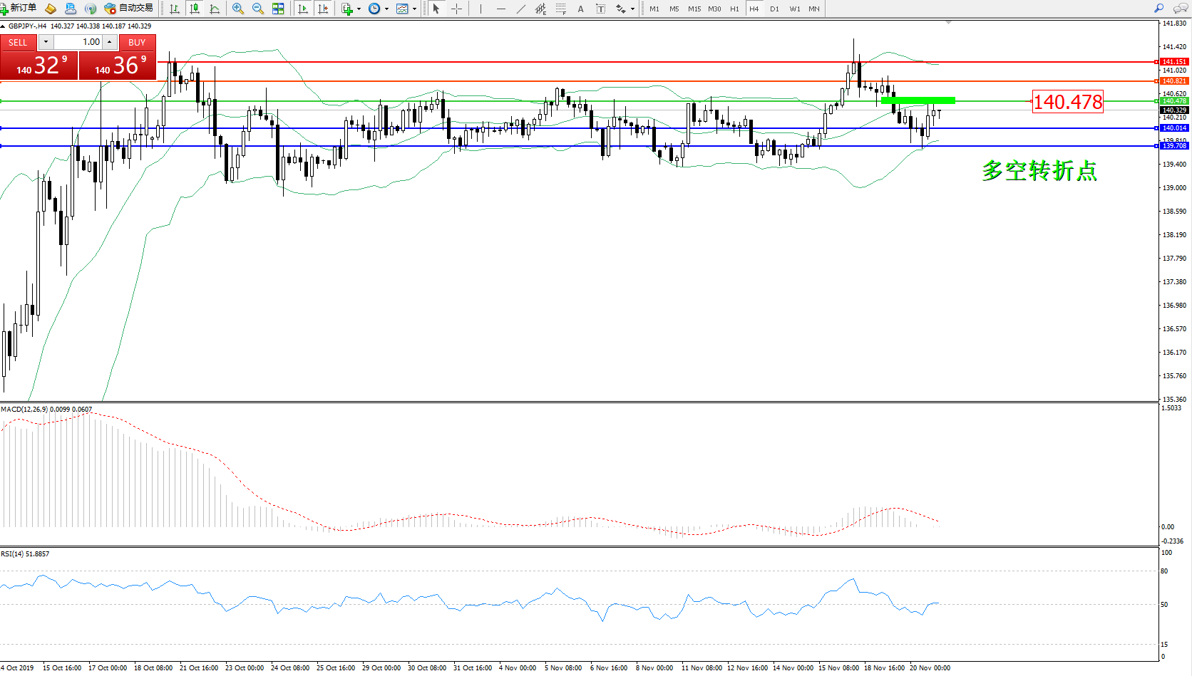 交易策略:140.478下方看跌,目标140.014、139.708