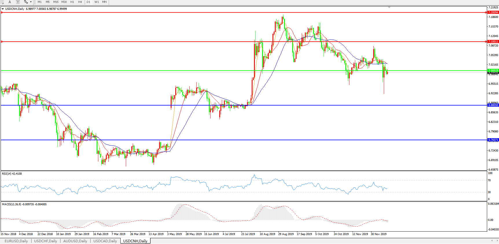 在岸人民币周一收跌近190点并失守7元整数关口,中间价则劲升创逾四个月新高。交易员称,此前各界企盼的贸易利多消息终于落地,但这却引发了多头资金在利多出尽之后的获利离场,午后购汇客盘增多亦令汇价承压;短期人民币或继续在7元附近整固。 交易员指出,在消息面预期最终尘埃落定后。短期人民币汇率暂时缺少进一步消息指引,交易的内生逻辑重新回到宏观经济走势、临近年底客盘刚性的结汇需求等方面。基于当前消息面背景,人民币在7元附近是合理水平。隔了一个周末,市场情绪已经消化的差不多了,在没有新消息的情况下,乐观的情绪会延续。  此外,中国方面周一发布了11月国民经济综合运行数据,各项数据总体符合预期,市场仍预期2020年中国经济将增长6%左右。