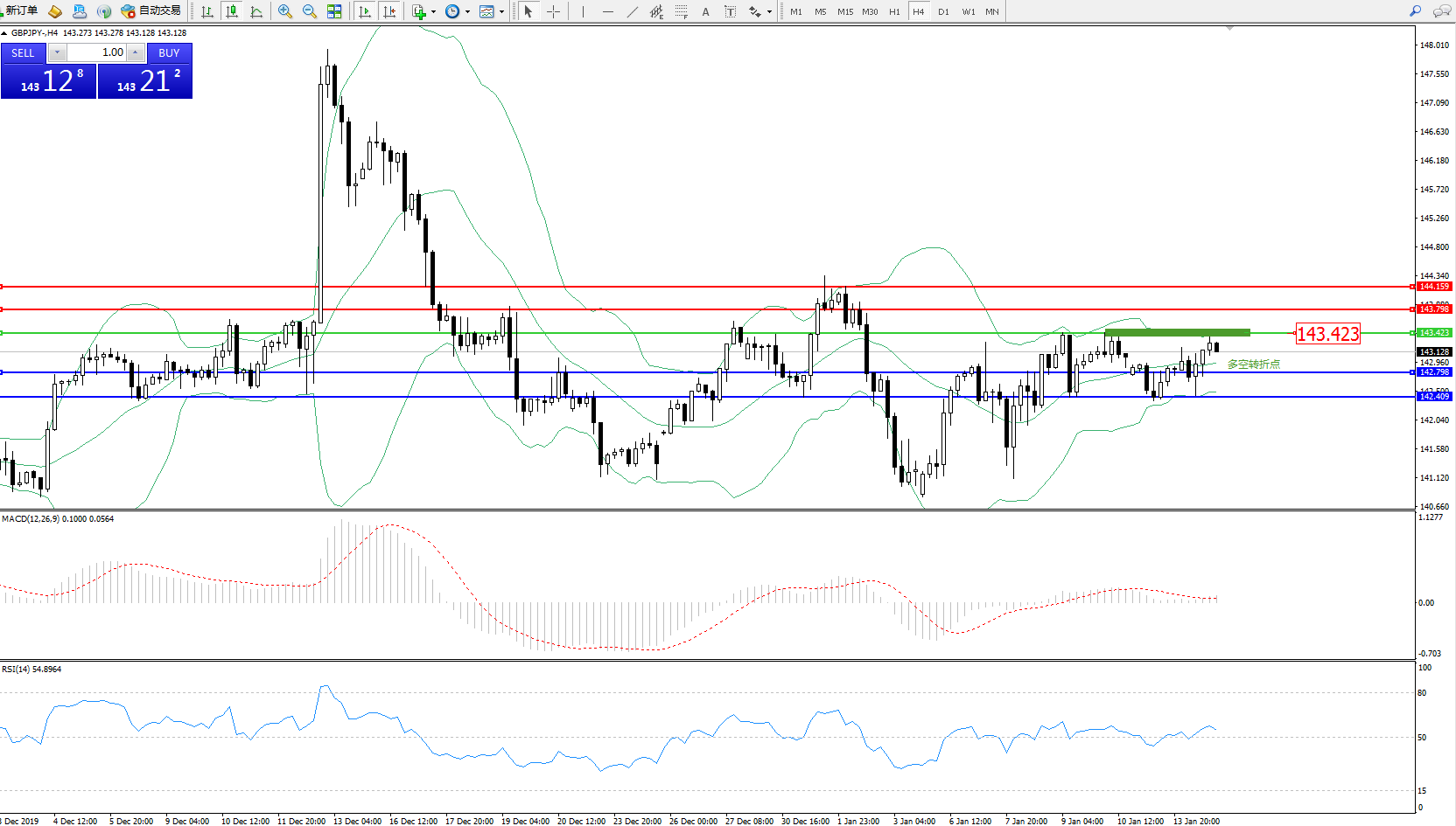 备选策略:143.423上方看涨,目标143.798142.409