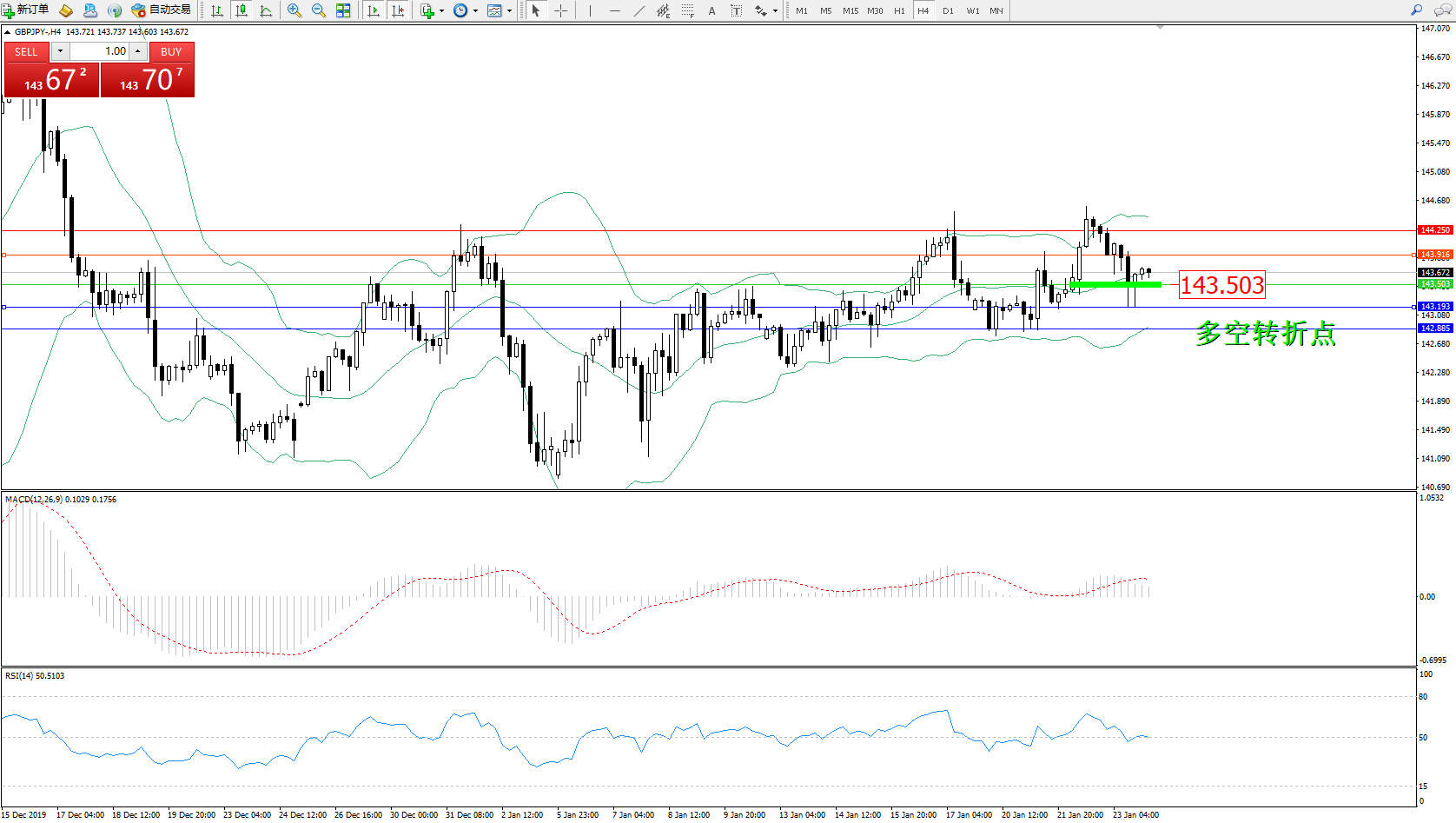 交易策略:143.503下方看跌,目标143.193142.885