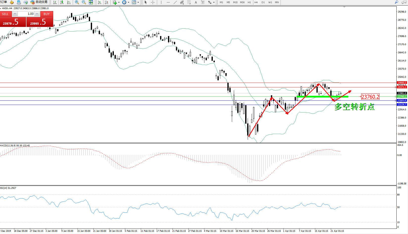 恒指HK50 ——4小时K线图显示: