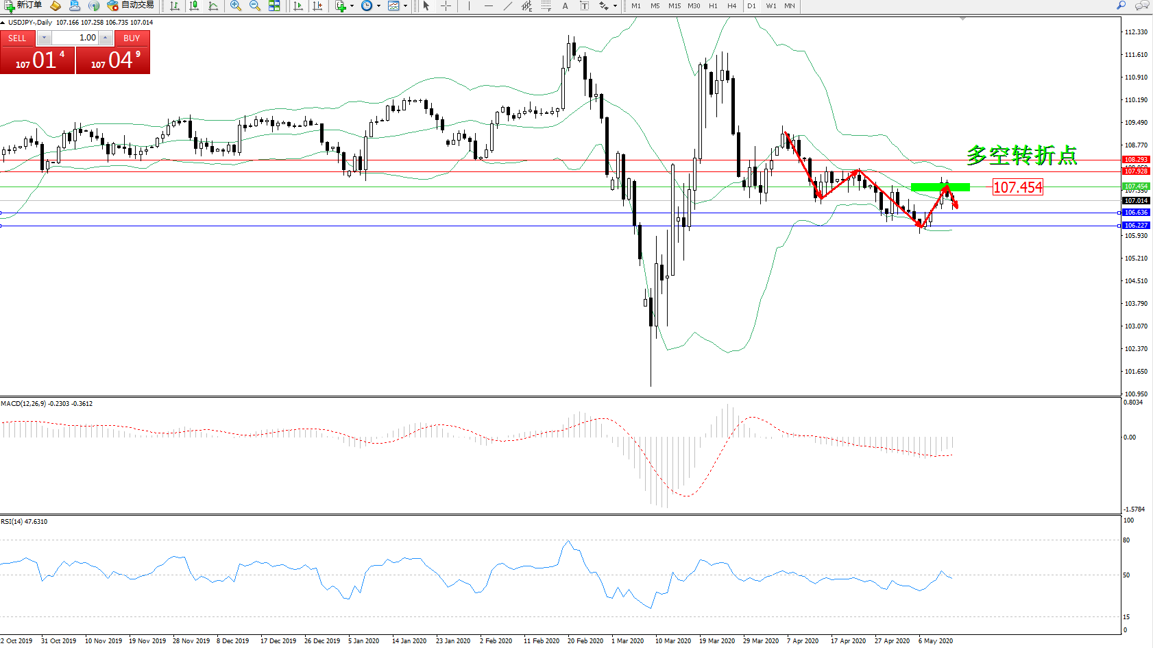 交易策略:107.454下方看跌,目标106.636106.227