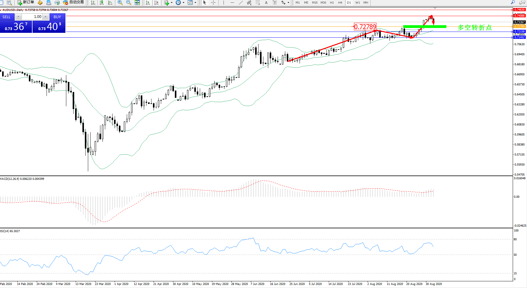 交易策略:0.72789上方看涨,目标0.74088、0.74830