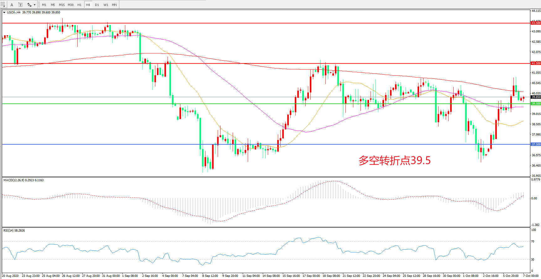 4小时图看,油价一度突破200周期均线后震荡回落,短期走势陷入震荡,39.5成为近期多空分水岭,MACD红柱增加,RSI指标走平,日内延续震荡概率较大。