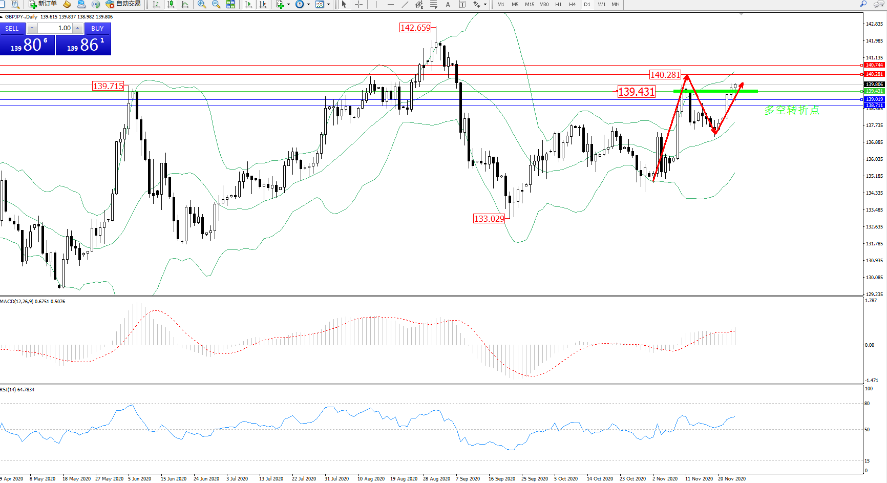交易策略:139.431上方看涨,目标140.281、140.744