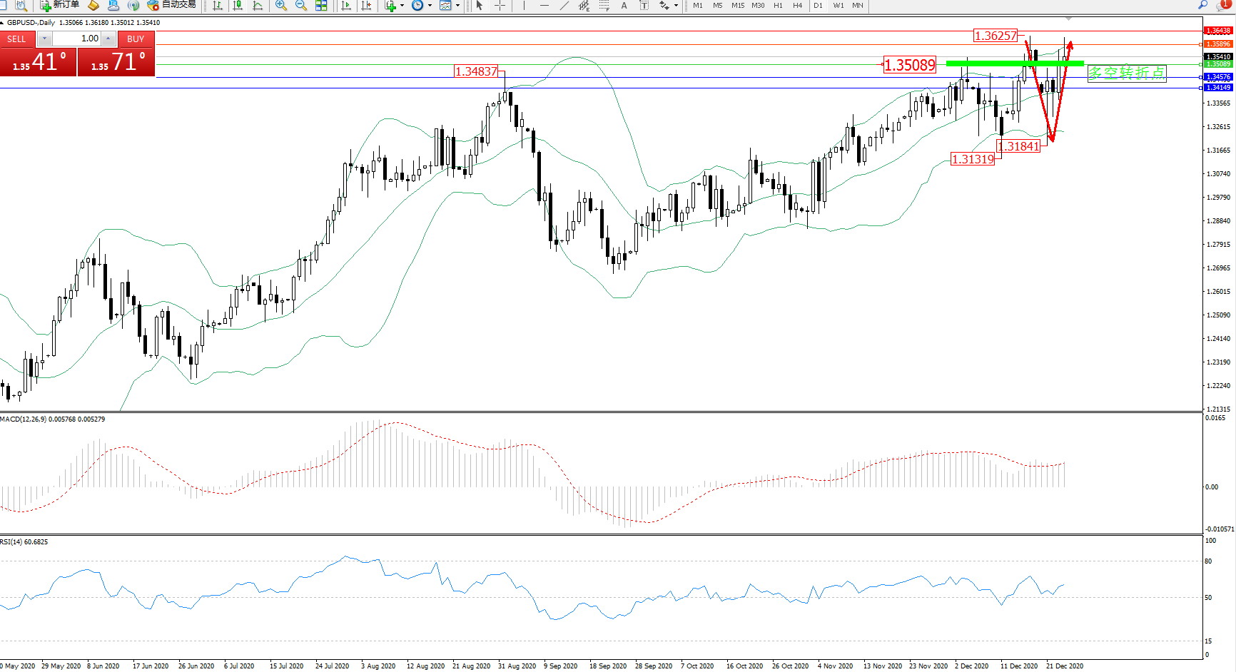 交易策略:1.35089上方看涨,目标1.35896、1.36438