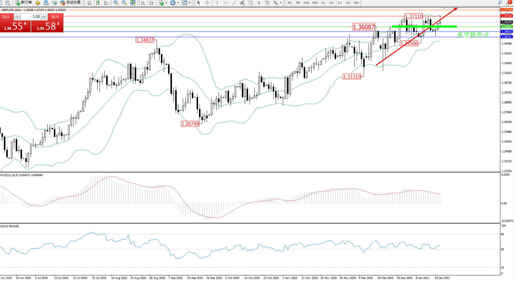 交易策略:1.36087上方看涨,目标1.37110、1.37710