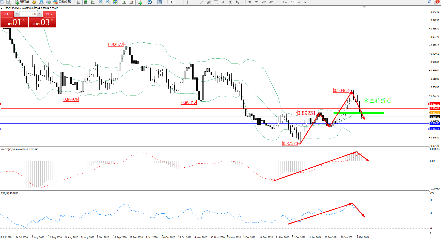 技术点评:多头动力维持在布林带指标通道中上轨区间持续震荡上扬,高位抵达0.90463位置节点后遇阻急速回撤下行,跌破布林带指标中轨附近节点后持续下挫中,布林带指标呈张口走势后有收口迹象,关注中轨下方附近关键节点,MACD指标处于多头区域维持震荡平移中,RSI指标处于多头区域高位震荡后缓慢回撤至50均衡线附近徘徊中;