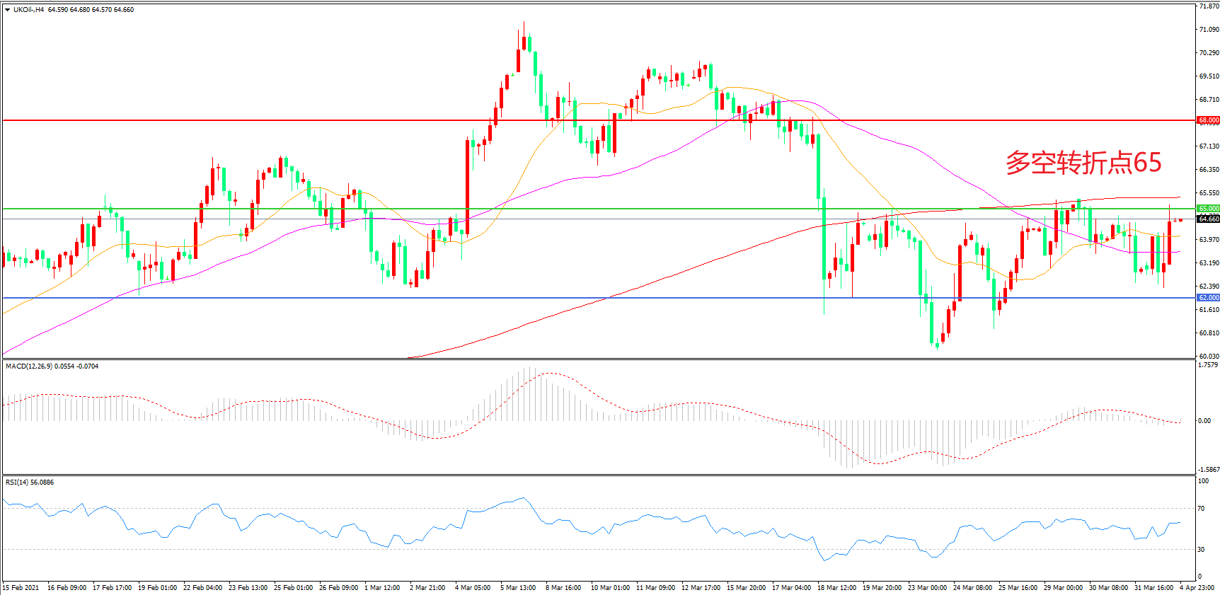 4小时图看,油价延续宽幅震荡走势,62美元成为下方支撑,65美元成为上方阻力,均线系统走平,MACD红柱缩短,RSI指标走平,日内延续震荡概率较大。