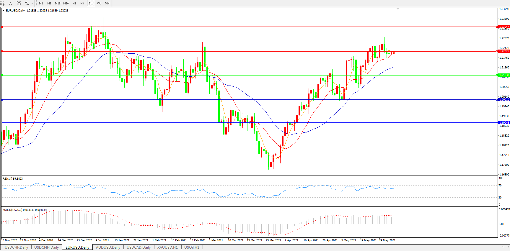 技术面简析:日图均线呈上行态势,汇价冲高乏力有走弱迹象,MACD运行于0轴上但量能开始微缩量,RSI缓步走升,预计短期汇价大概率将进一步上行。
