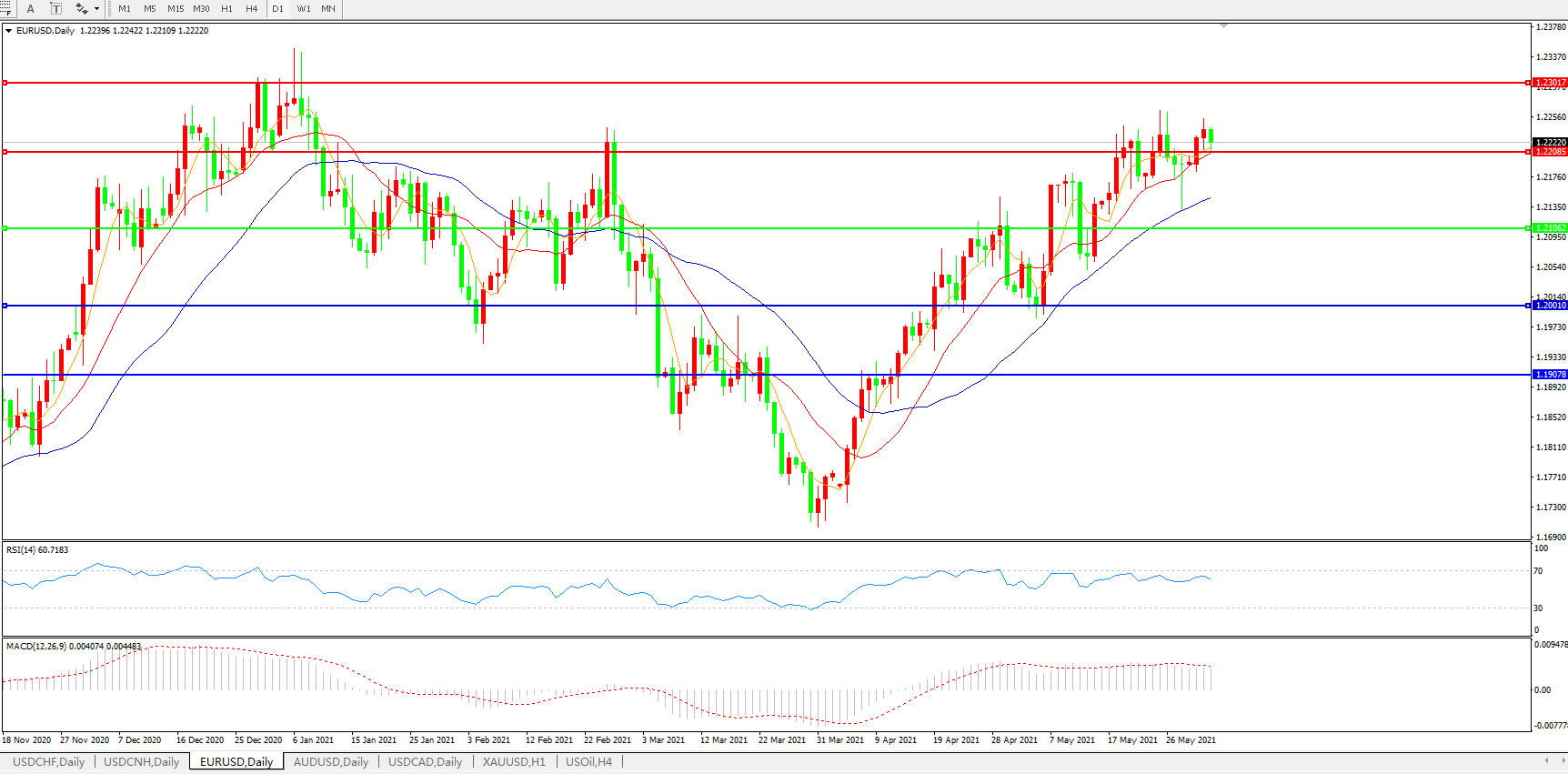 技术面简析:日图均线呈上行态势,汇价高位开始整理,MACD运行于0轴上但量能开始微缩量,RSI小幅走弱,预计短期汇价大概率将在整理后进一步上行。