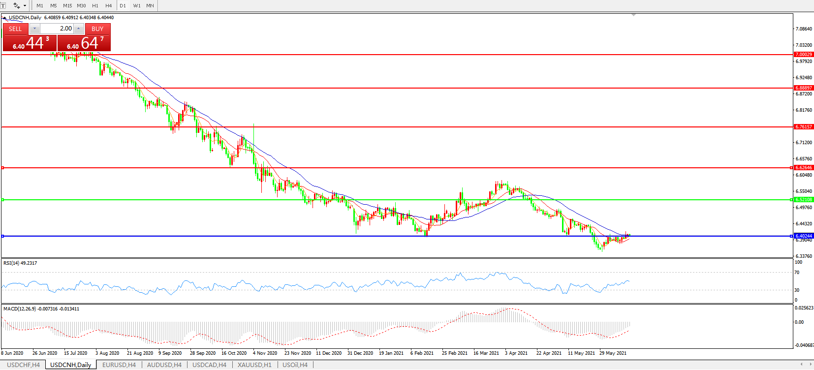 备选策略: 在6.5200之上,看涨,目标价位为6.6270,然后为6.7615。