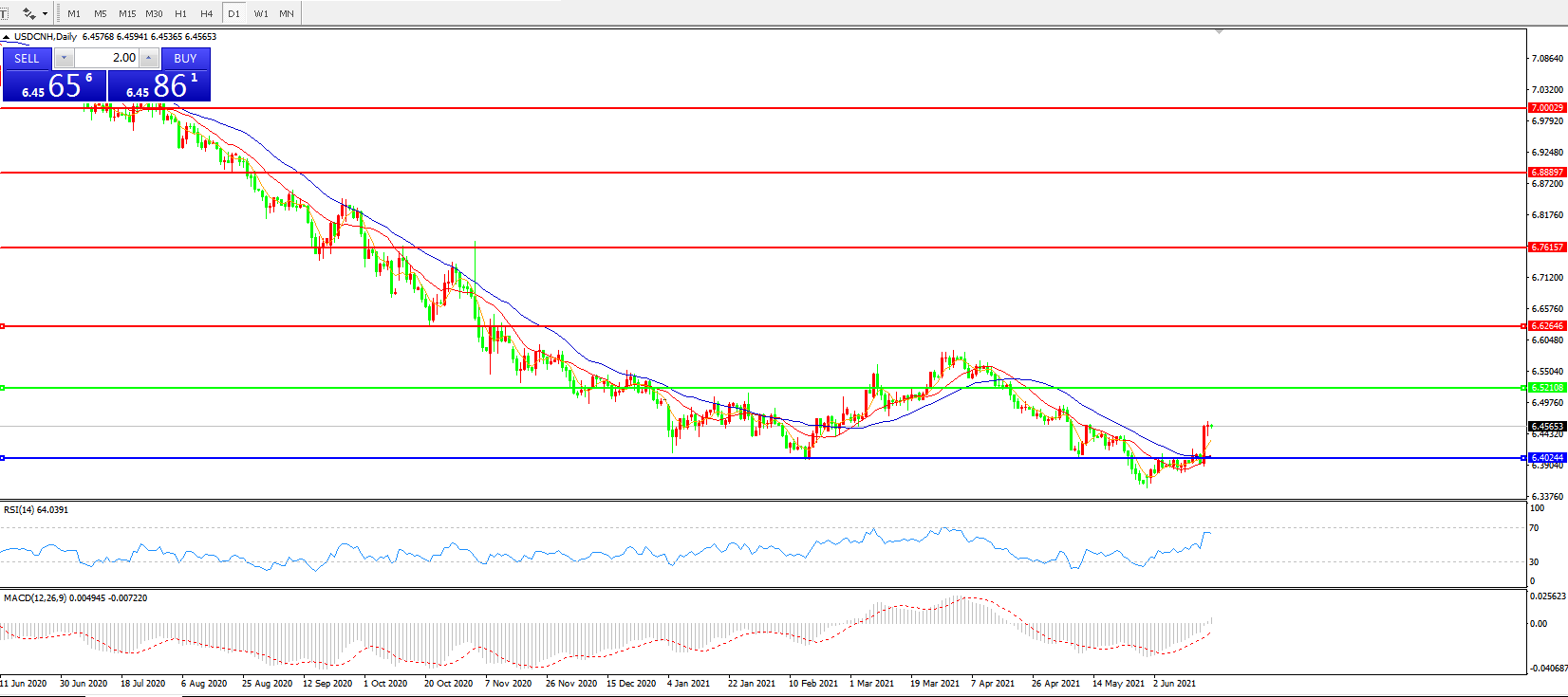 备选策略: 在6.5200之上,看涨,目标价位为6.6270,然后为6.7615。