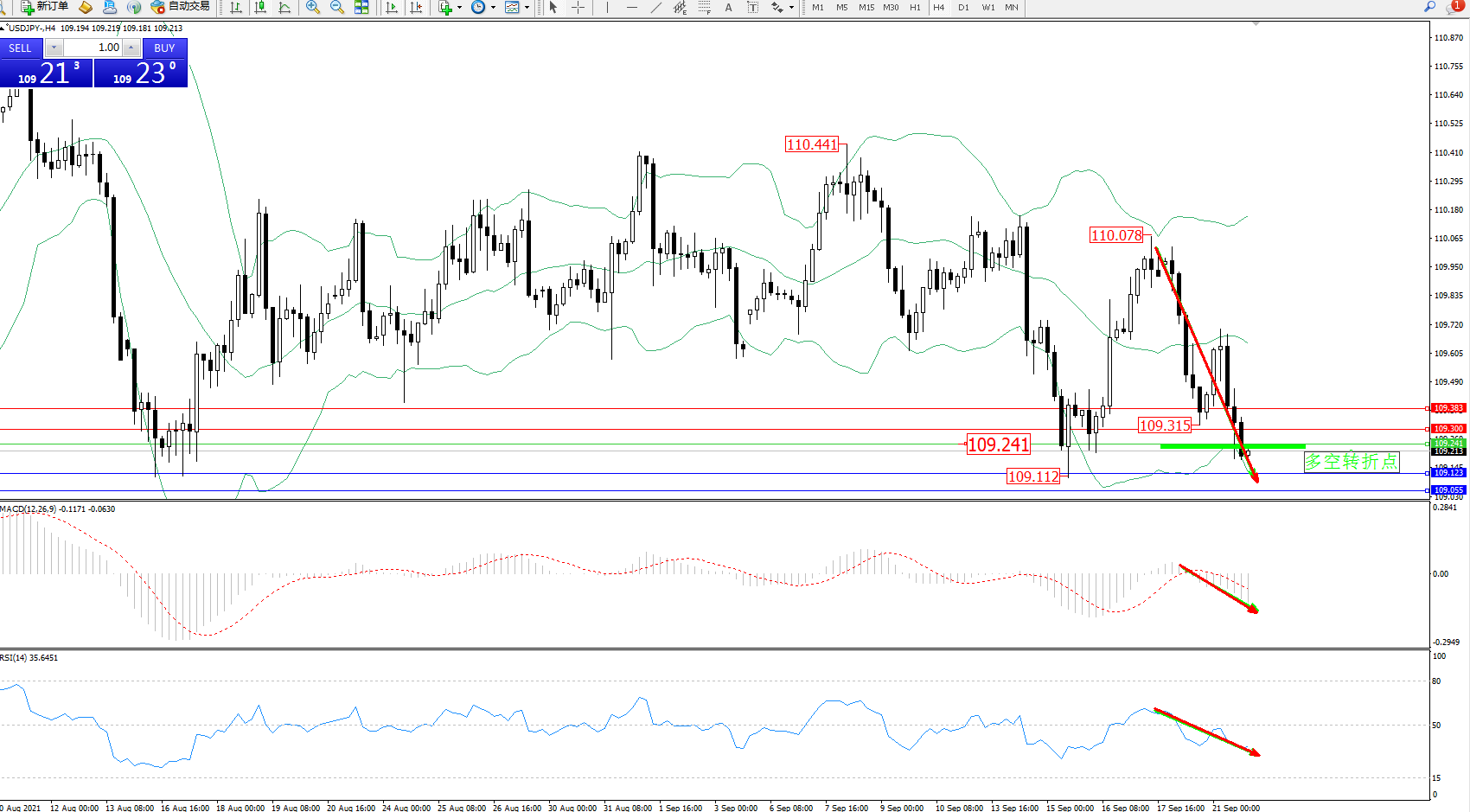 技术点评:高位空头动力持续下行后,触及布林带指标下轨附近节点得到短暂支撑,开始维持低位弱势整理中,短期空头动力有所减弱,但下行趋势依旧,前期低位109.112位置近在咫尺破位在即,布林带指标呈缓慢张口走势中,MACD指标处于0轴线下方空头区域维持震荡下行,RSI指标处于50均衡线下方空头区域维持整理中;
