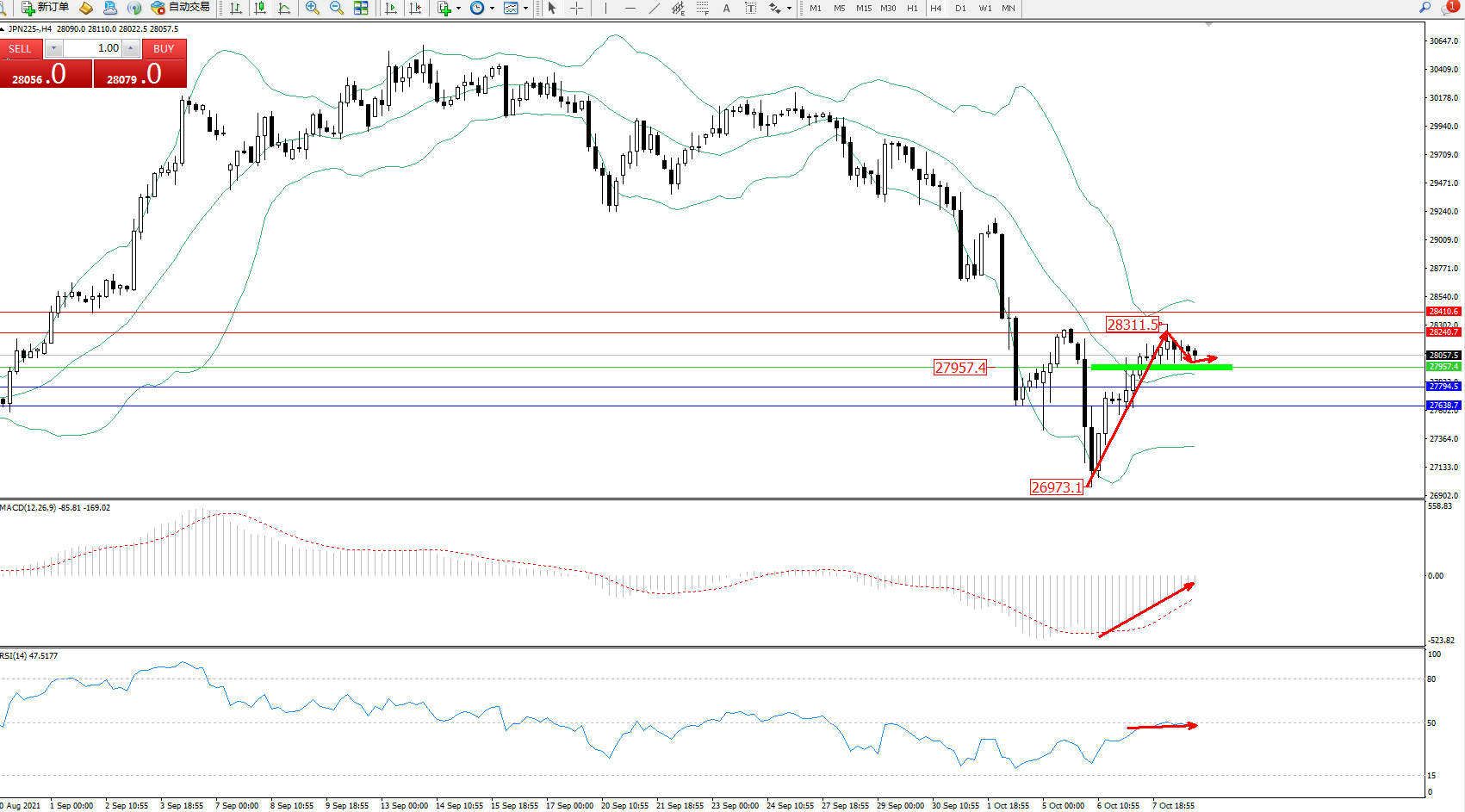 交易策略:27957上方看涨,目标28240、28410