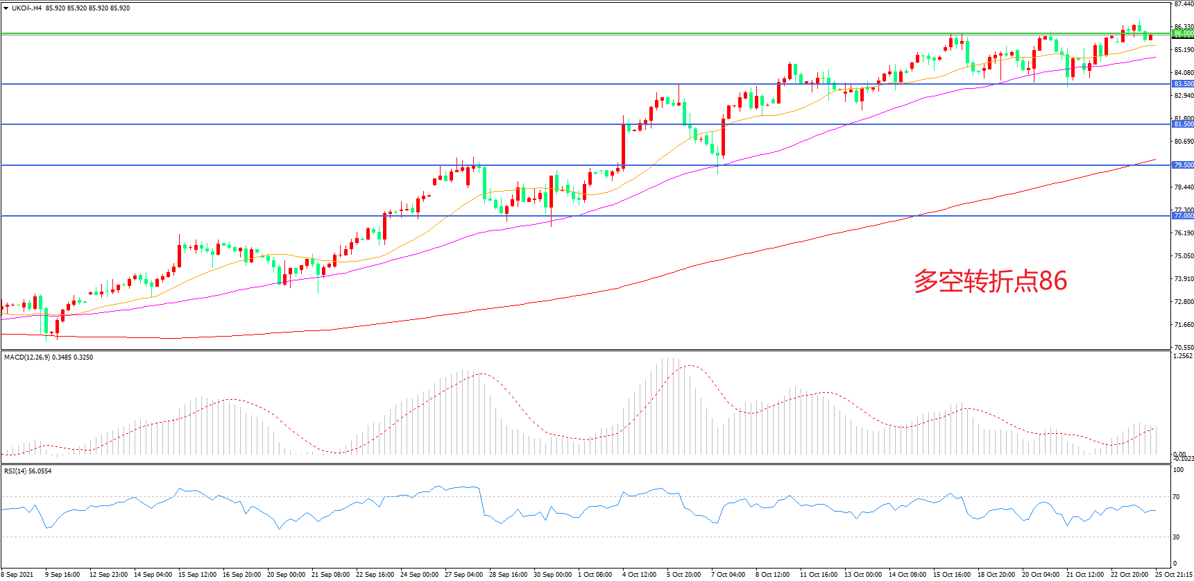 4小时图看,油价以均线系统为依托,整体呈现上行形态,MACD红柱缩短,RSI指标走平,日内延续震荡概率较大。