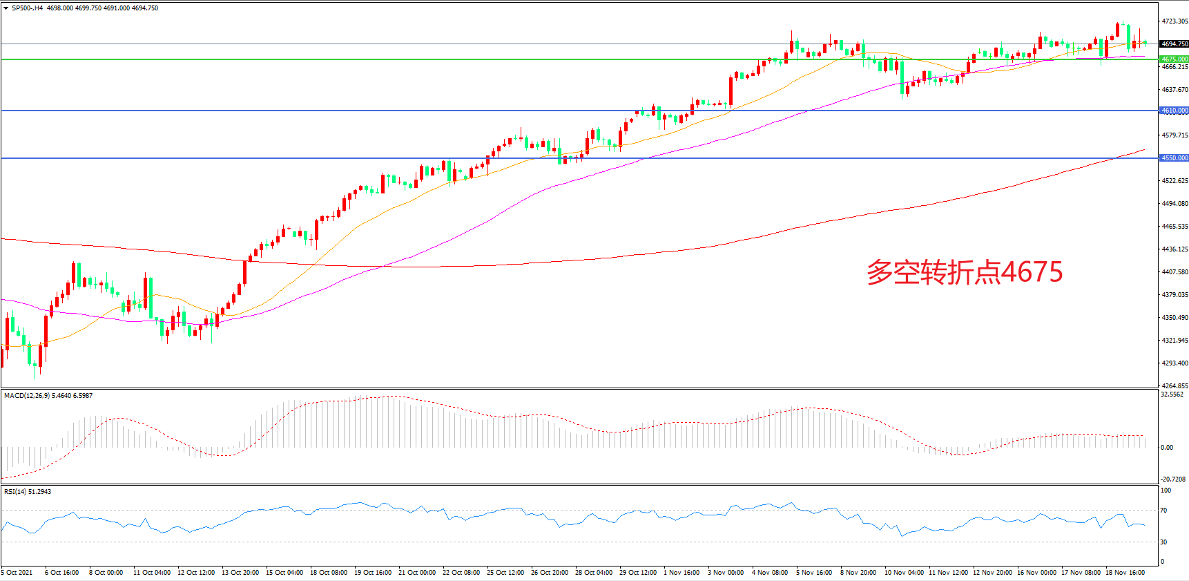 4小时图看,标普500以4675一线为依托再度反弹,短期走势回暖,均线系统粘合形成支撑,MACD红柱增加,RSI指标走平,日内震荡上行概率较大。