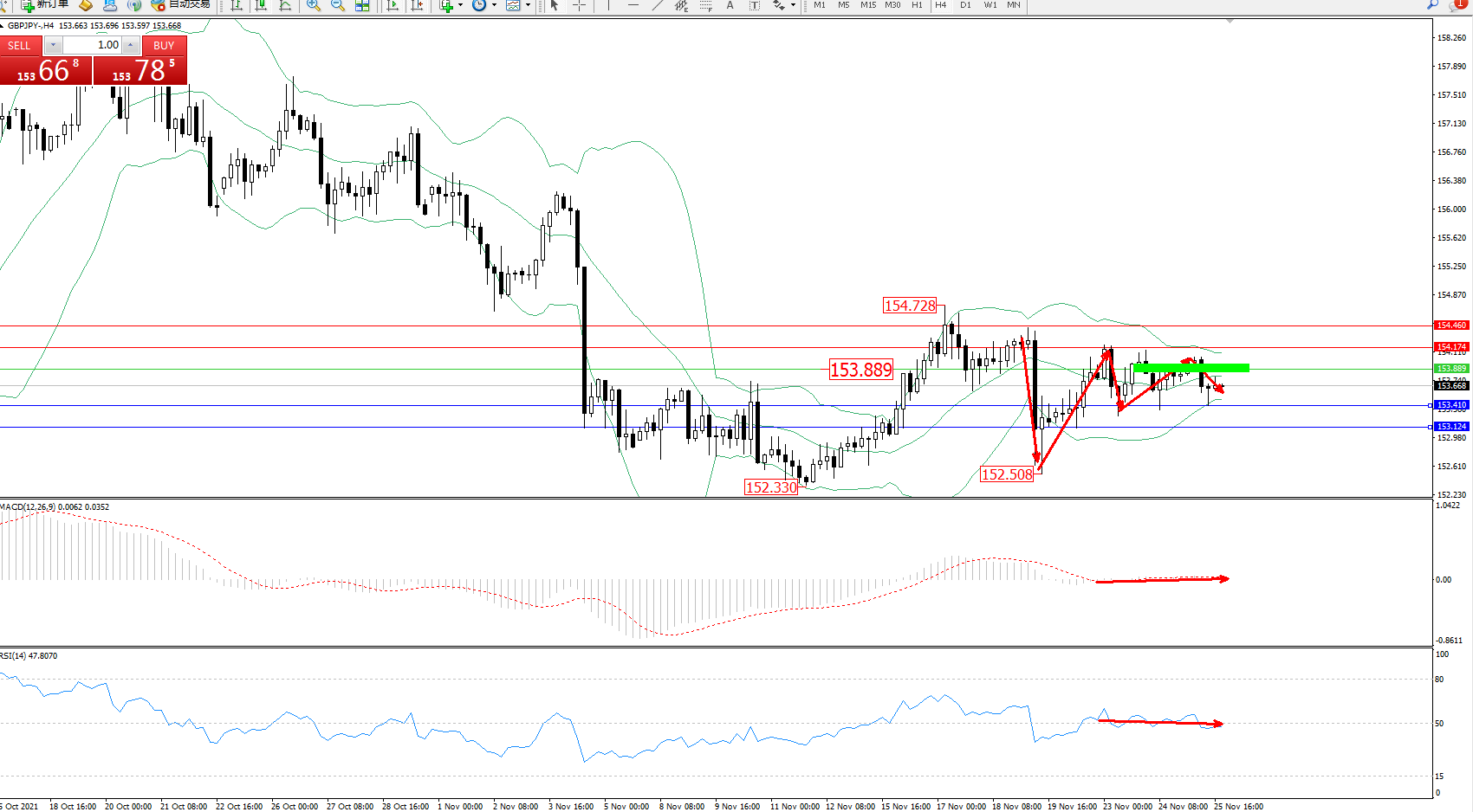 交易策略:153.889下方看跌,目标153.410、153.124