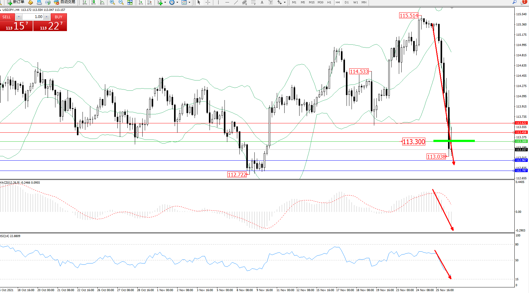 技术点评:空头动力急速下挫,延续布林带指标下轨附近不断下行,低位抵达113.038位置得到短暂支撑震荡,布林带指标呈张口走势态势良好,短期跌势或将延续,MACD指标空头动力急速下挫至0轴线下方空头区域不断下移,RSI指标处于空头区域维持震荡下行至50均衡线下方空头区域持续下探;