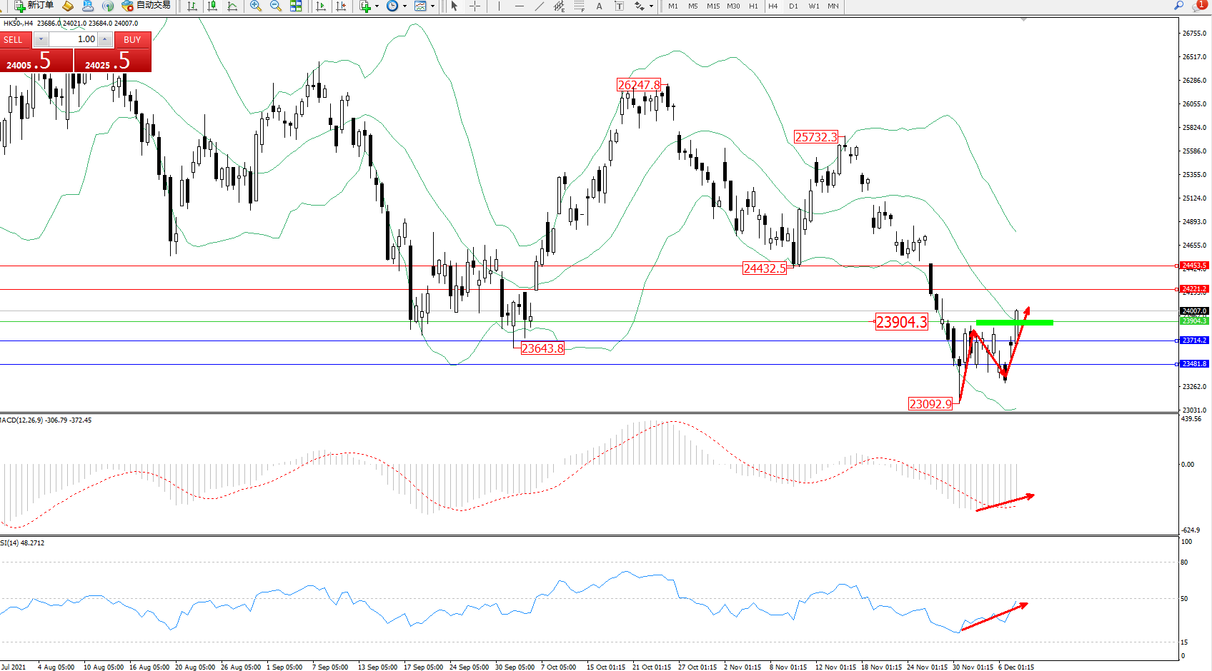 恒指HK50 ——4小时K线图显示: