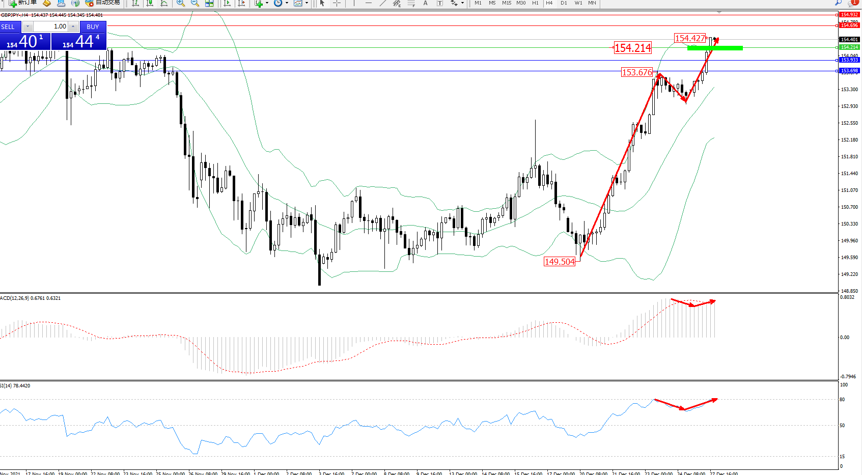 交易策略:154.214上方看涨,目标154.696、154.932