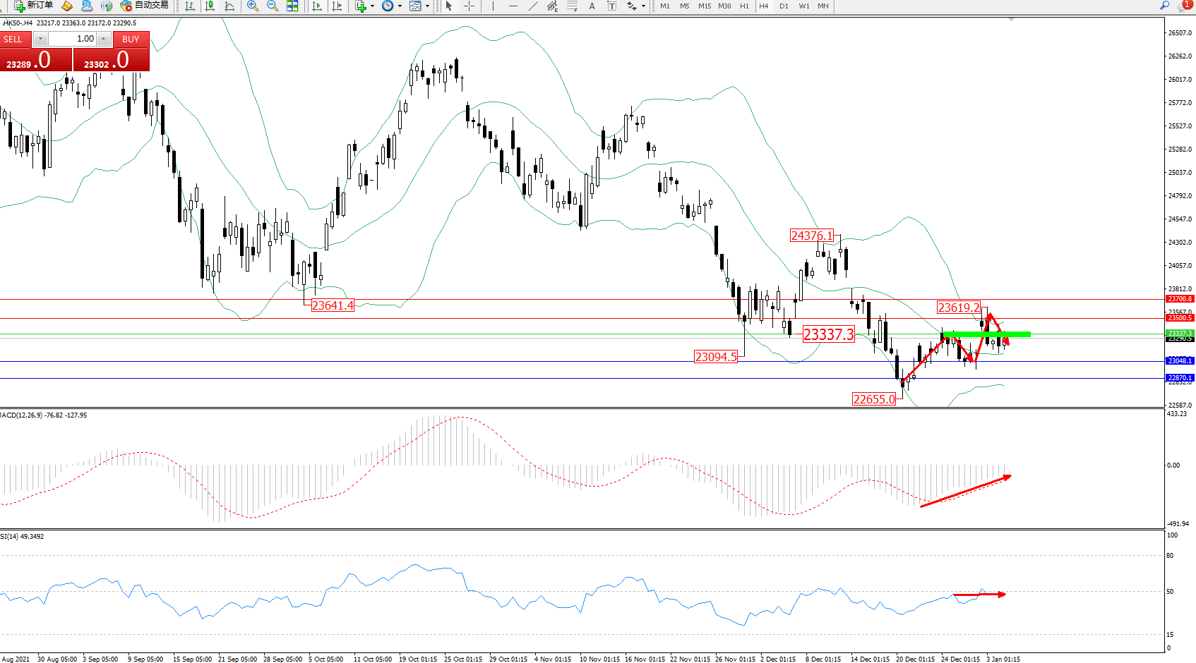恒指HK50 ——4小时K线图显示:
