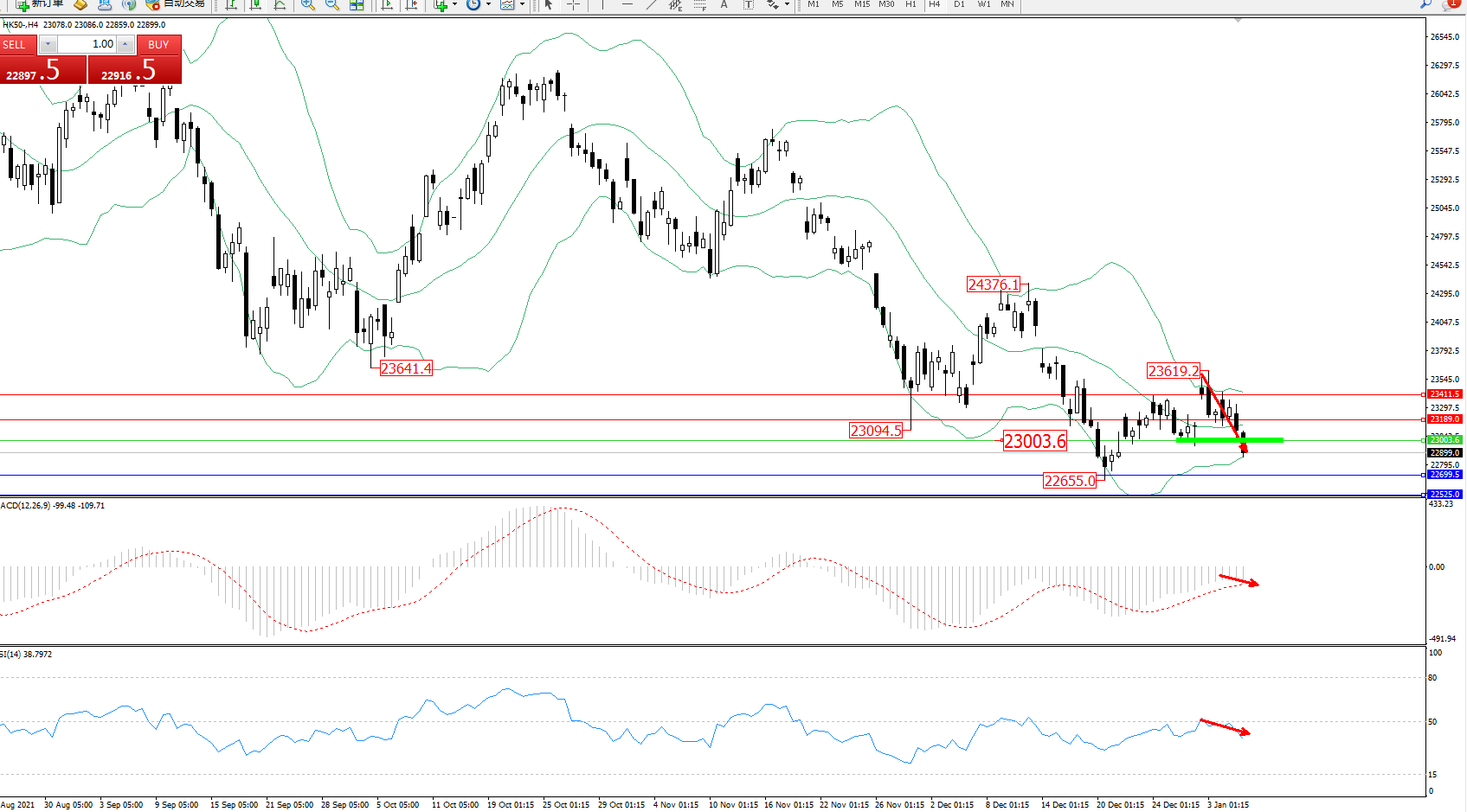 恒指HK50 ——4小时K线图显示: