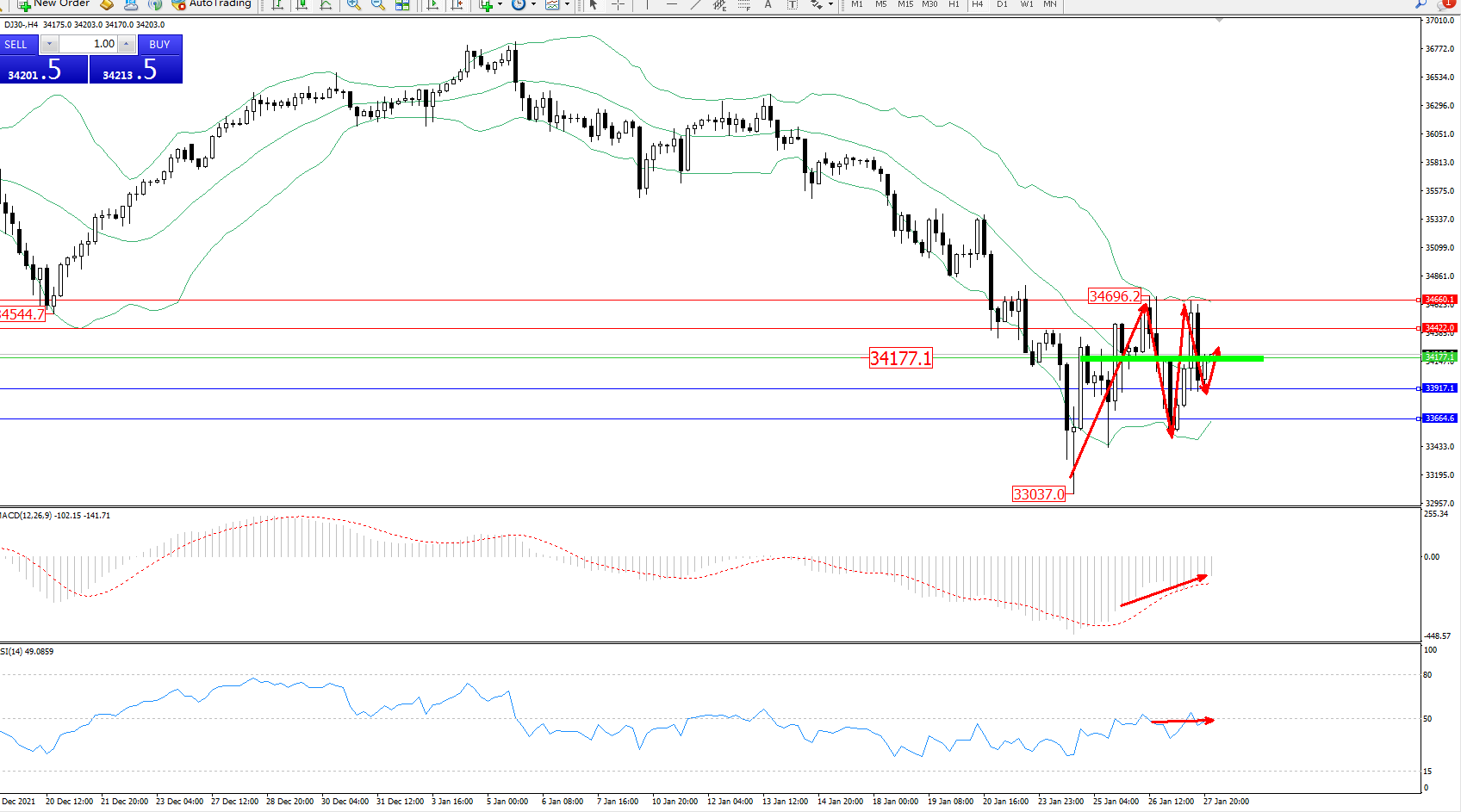 道琼斯指数DJ30——4小时K线图显示: