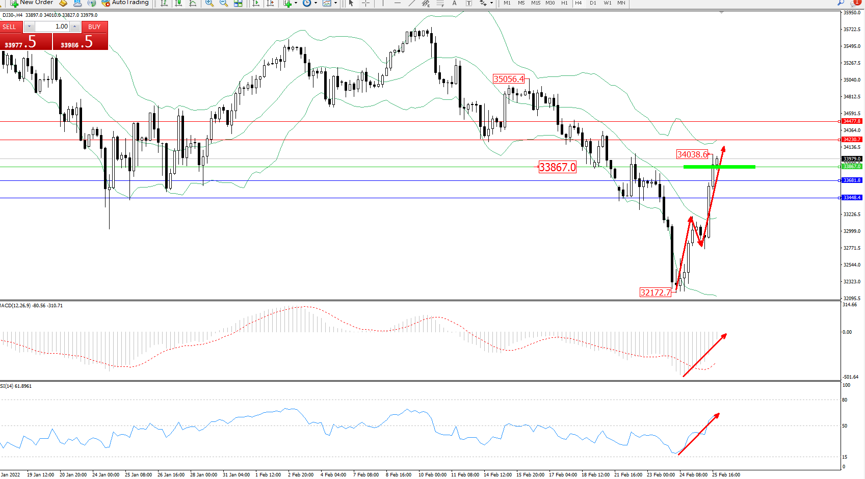 道琼斯指数2月25日(周五)收盘上涨834.72点,涨幅2.51%,报34058.55点;美国股市连续第二天上涨,因为经济数据和俄乌战争的不确定性导致交易员下调对美联储下月大幅加息的押注。地缘局势紧张继续令高估值科技股承压,美国1月份经通胀调整的消费者支出增长超过预期。2月末消费者信心较月初有所改善,但由于通胀担忧依然高企,消费者信心指数仍维持在10年低点附近。