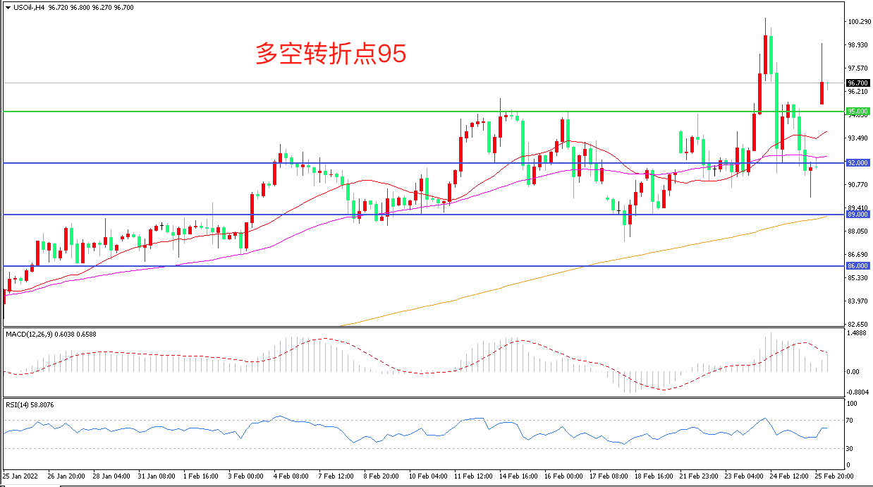 4小时图看,油价跳空高开后延续强势表现,短期走势偏强, 95美元成为多空分水岭,均线系统走平,MACD红柱缩短,RSI指标走平,日内震荡上行概率较大。