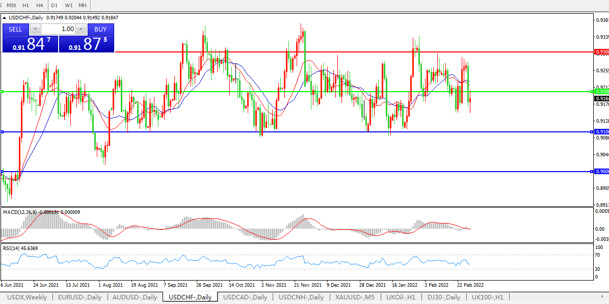 交易策略:0.9200下方看跌,目标0.9100、0.9000