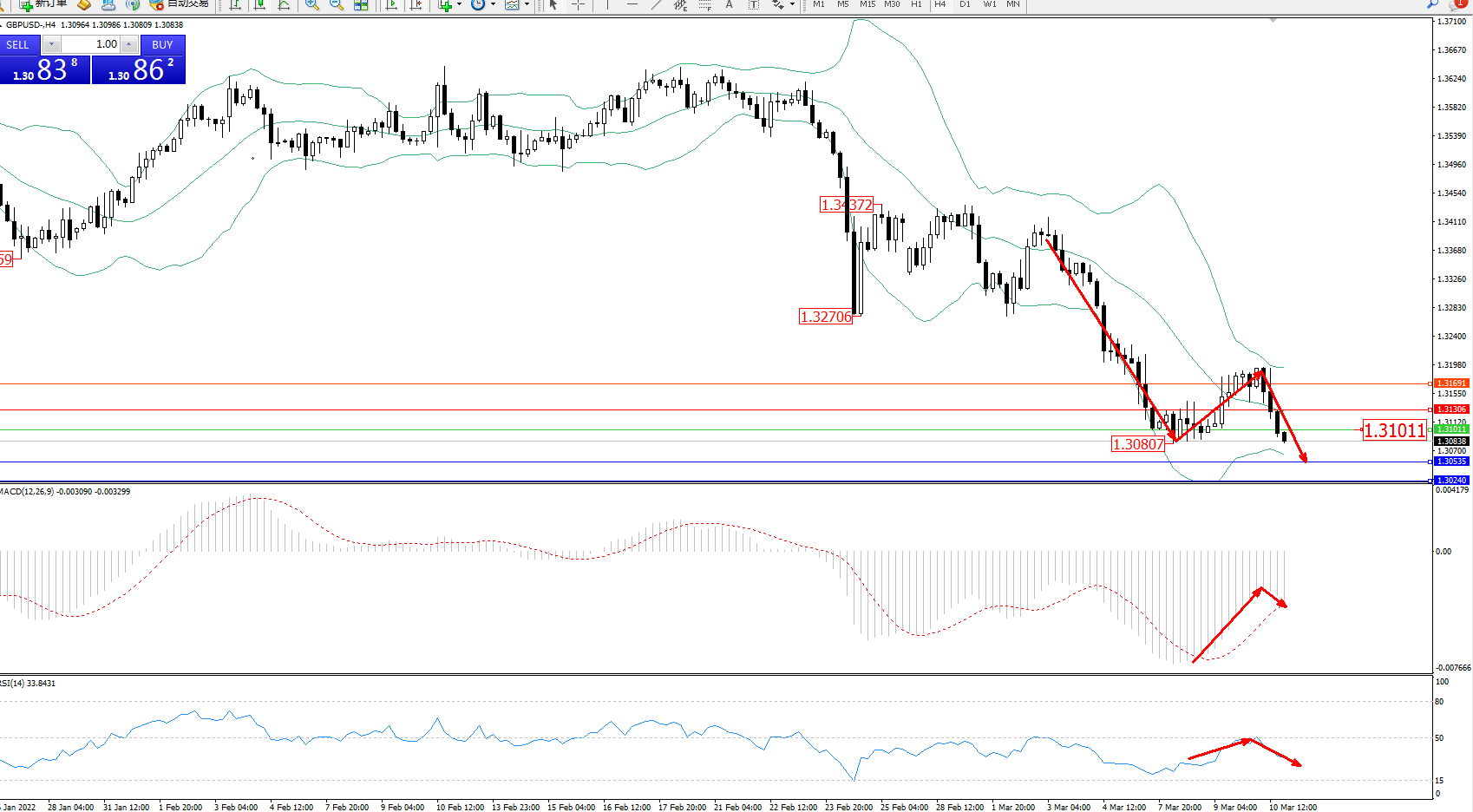 技术点评:空头动力延续布林带指标通道内维持震荡下行,低位即将再度触及前底1.30807附近节点,短期空头下行趋势态势良好,跌势未见有止步迹象,布林带指标呈收口走势持续后有继续向下移动态势,MACD指标处于空头区域维持震荡上移后开始反转向下移动,RSI指标处于空头区域维持震荡上移至50均衡线附近弱势徘徊后再度下挫;