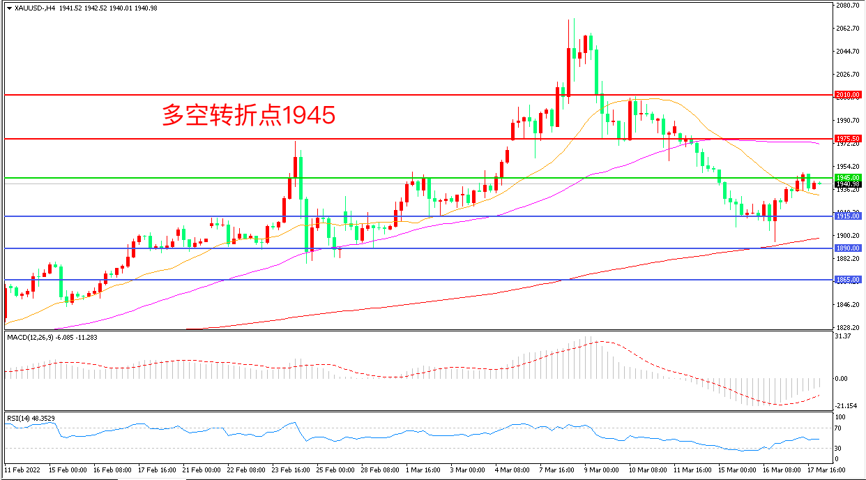 周四(3月17日),俄罗斯总统新闻秘书称,俄乌代表团谈判工作仍在继续,有关乌克兰谈判取得重大进展的报道“错误”,现货黄金闻讯冲高,收报1940.50美元/盎司。中期来看,投资者消化美联储加息的事实,滞胀风险可能将美联储推入两难困境,全球经济与金融市场的不确定性将进一步支撑金价。
