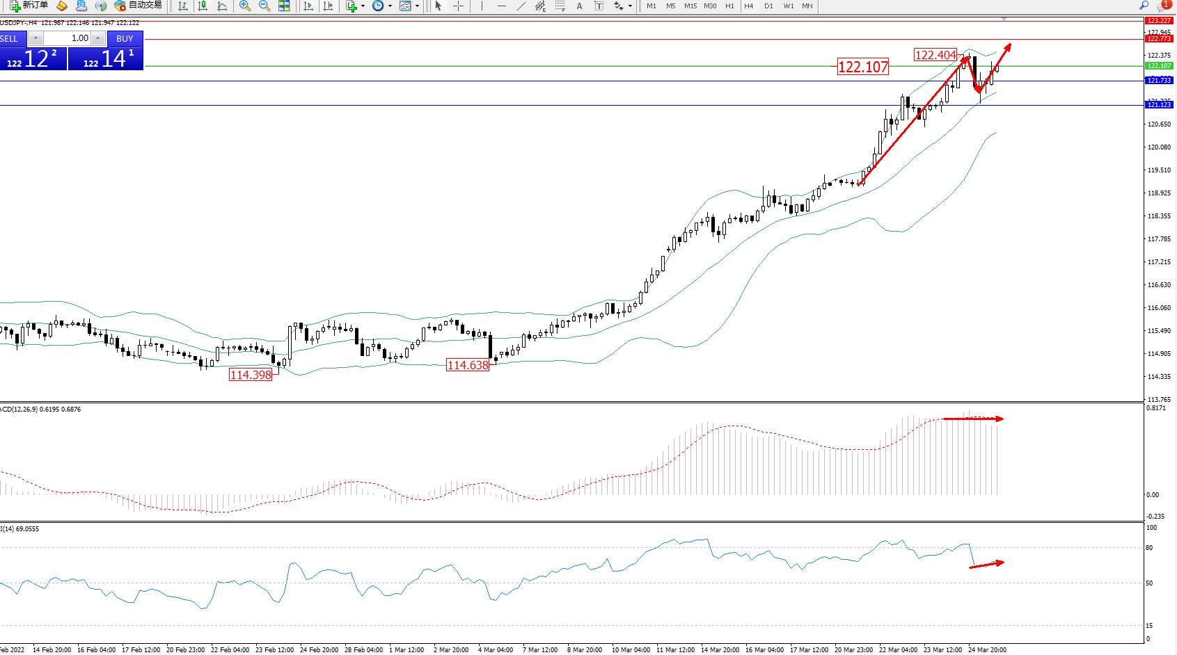 交易策略:122.107上方看涨,目标122.773、123.227