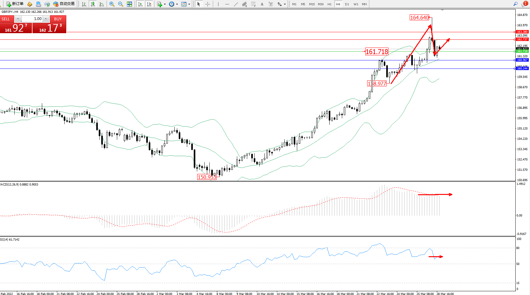 技术点评:多头动力延续布林带指标通道中上轨附近持续震荡上扬,高位抵达164.640位置附近遇阻回撤,纠结于中上轨区间窄幅整理向上移动,布林带指标呈上行趋势走势态势良好,且逐渐张口走势不断上移,MACD指标处于多头区域维持整理平移,RSI指标处于多头区域维持窄幅整理中;